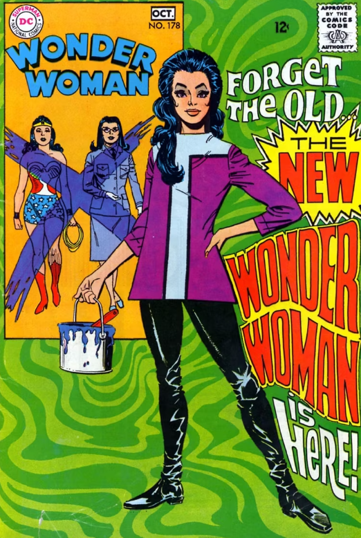 - 1968년 원더우먼의 캐릭터에 대한 주요 개편에는 그녀가 자신의 능력을 포기하고, 무술 전문가가 되고, 의식 의상을 포기하는 것이 포함되었습니다.