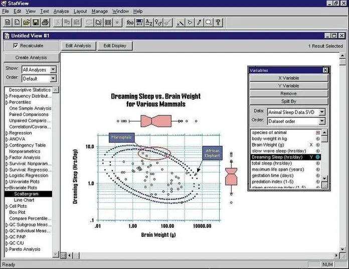 1985 년 통계 연산을 수행하기 위해 매킨토시 컴퓨터 용 Statview 소프트웨어가 출시되었습니다. 그래픽 사용자 인터페이스 (GUI)의 선구자 중 하나입니다. 또한 정수, 실수, 문자열 등을 통합하여 ANOVA, 카이-제곱 및 T- 검정과 같은 추론 통계 테스트를 수행합니다.