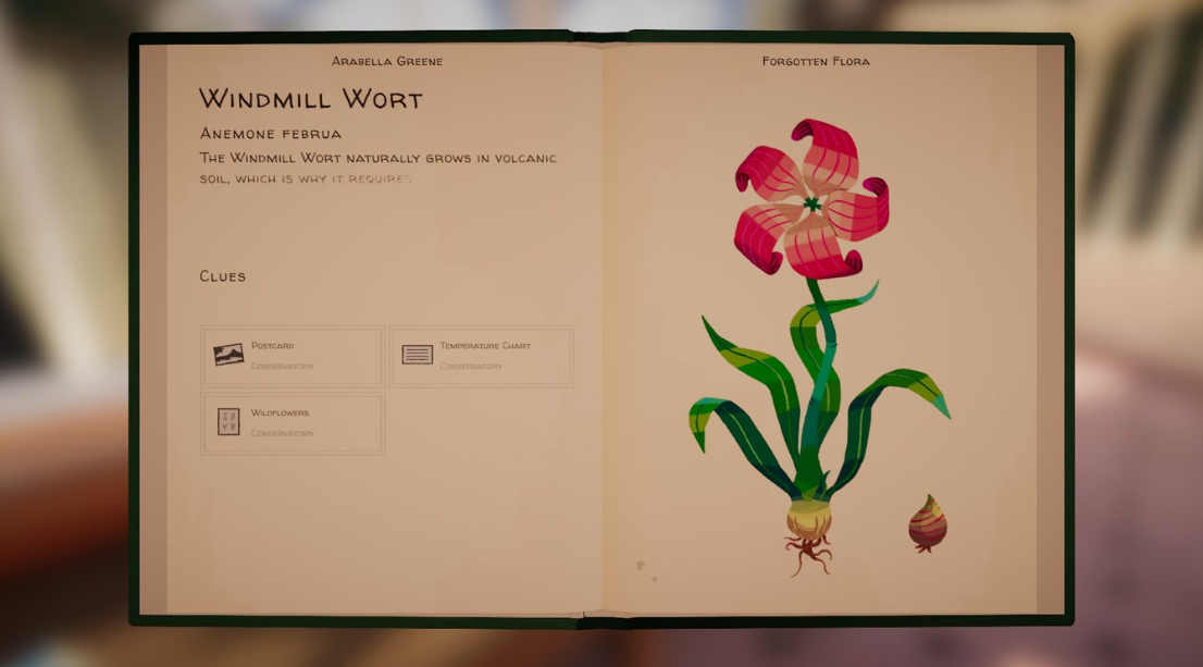 예를 들어, 화분 벤치에서 첫 번째 씨앗 묶음을 집으면 Windmill Wort라는 가상의 식물의 각인이 드러납니다. 근처에서 발견되기를 기다리는 세 개의 단서를 위한 슬롯이 있습니다. 처음부터 이러한 단서는 이 퍼즐을 푸는 데 도움이 될 뿐만 아니라 아라벨라와 그녀가 살고 있는 저택에 대한 훨씬 더 큰 이야기를 하나로 엮는 데도 도움이 될 것이 분명했습니다. 칠판에 있는 열과 야생화 차트는 내가 적절한 온도를 알아내는 데 도움이 되었습니다. Windmill Wort를 키우면 스모그를 제거하기 위해 말 그대로 풍차처럼 회전하는 사랑스러운 분홍색 꽃이 피었고, 그 시대의 최근 산업화 문제를 논의한 신문과 현명하게 연결되었습니다.