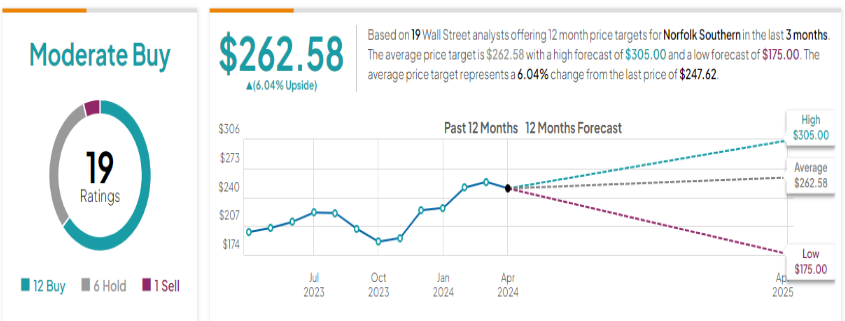 전반적으로 NSC는 매수 12개, 보류 6개, 매도 1개를 포함하는 최근 분석가 리뷰 19개를 기반으로 보통 매수 합의 등급을 받았습니다. 주식은 247.62달러에 판매되고 있으며 평균 목표 가격 262.58달러는 1년 동안 6%의 소폭 상승을 의미합니다.
