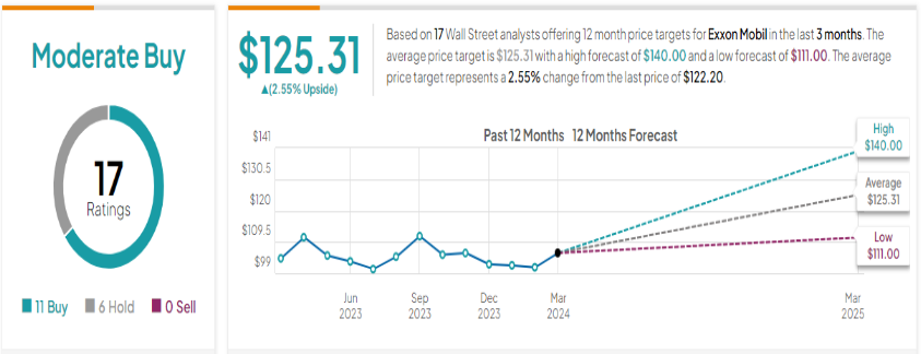 전반적으로 XOM은 11개의 매수와 6개의 보류를 포함하는 17개의 최근 리뷰를 기반으로 Street의 분석가로부터 보통 매수 합의 등급을 받았습니다. 즉, 125.31달러의 평균 목표 주가는 당분간 주가가 범위 내에서 유지될 것임을 시사합니다.