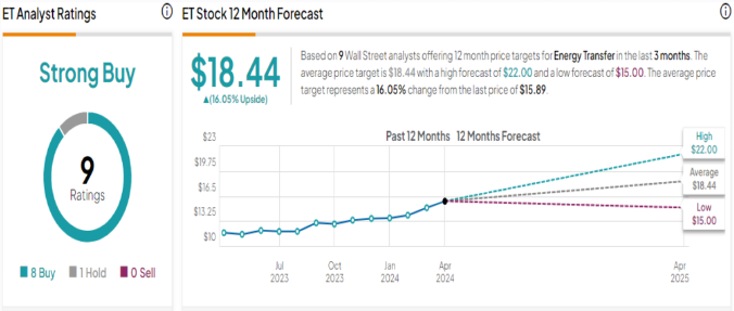 이것이 분석가에게 의미하는 바는 1년 동안 19.5%의 상승 잠재력을 암시하는 19달러 목표 가격을 가진 매수 등급입니다. 전반적으로 Energy Transfer는 최근 9개의 분석가 리뷰를 통해 Strong Buy 합의 등급을 지원하며 8대 1로 매수보다 매수를 선호합니다. 주가는 15.89달러에 거래되고 있으며, 평균 목표 주가 18.44달러는 향후 1년 동안 16%의 잠재적 이익을 얻을 수 있음을 시사합니다.