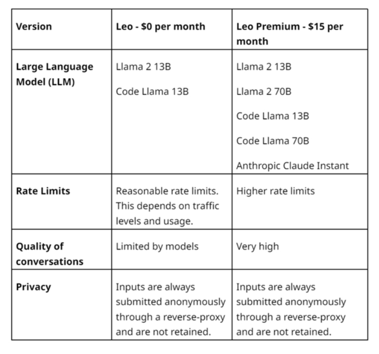 Brave 데스크톱 사용자에게는 기본 Leo가 무료로 제공됩니다. Leo Premium은 월 15달러이며 Anthropic의 Claude 도우미를 사용하여 다국어 환경, 코딩 및 우수한 논리적 추론에서 향상된 응답을 제공합니다.