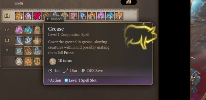 이는 주문을 시전하는 것과 동일하지는 않지만 정확히 동일한 AoE 효과를 갖습니다. 그리스 병을 던지면 지형이 어려움으로 변경되어 아무런 피해도 입히지 않지만 캐릭터를 쓰러뜨릴 수 있는 기회가 있습니다. 그들은 공격하거나 이동할 수 없으며 행동을 소비하거나 다음 차례가 일어날 때까지 기다려야 합니다.