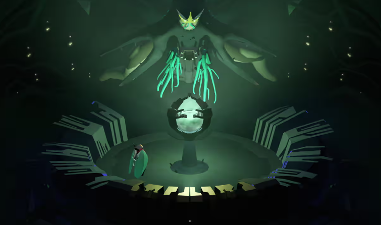 외계인이라고 하면 누에고치의 주민들은 초자연적이고 곤충과 같은 모습을 하고 있는데, 예술가 어윈 코(Erwin Kho)가 주인공에게 옷을 입히면서 도달한 것입니다. 원래는 "지루한" 우주비행사였지만 그는 이렇게 말합니다. "조금 더 흥미롭게 만들기 위해 망토를 씌웠습니다." 그런 다음 그는 망토를 둘로 나누었고 "갑자기 멀리서 보면 조금 곤충처럼 보였습니다." 그 단순한 변화로부터 게임 전체의 곤충 같은 모습이 생겨났고, 거기에서 뒷이야기가 나왔습니다. Schmid와 Carlsen의 이전 스튜디오의 전통을 유지하면서도 스토리는 의도적으로 불투명하게 유지됩니다. Schmid는 “우리는 선수들에게 그것을 주고 싶지 않고 그들이 스스로 발견할 수 있기를 원합니다.”라고 말합니다. "이 모든 것들은 암시되어 있지만 시각적으로만 암시됩니다. 텍스트가 없습니다."