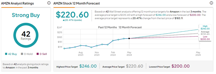 월스트리트 분석가들은 아마존 주식에 대해 계속해서 낙관적이며, 대다수는 인상적인 실적을 달성한 후 목표 가격을 높였습니다. 전반적으로 해당 주식은 42개의 만장일치 매수를 기반으로 Strong Buy 합의 등급을 받았습니다. 아마존 주식의 평균 목표가 인 $220.60은 현재 수준보다 20.5%의 상승 여력이 있음을 의미합니다.