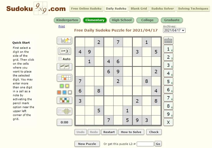 온라인 스도쿠를 플레이하면 한 번의 클릭으로 이동을 다시 시작하거나 실행 취소 할 수 있습니다. 성공하기 전에 무제한으로 시도 할 수 있습니다. 안타깝게도 스도쿠 온라인은 스마트 폰에 최적화되어 있지 않습니다. 따라서 모바일 장치에서는 게임을 할 수 없습니다.