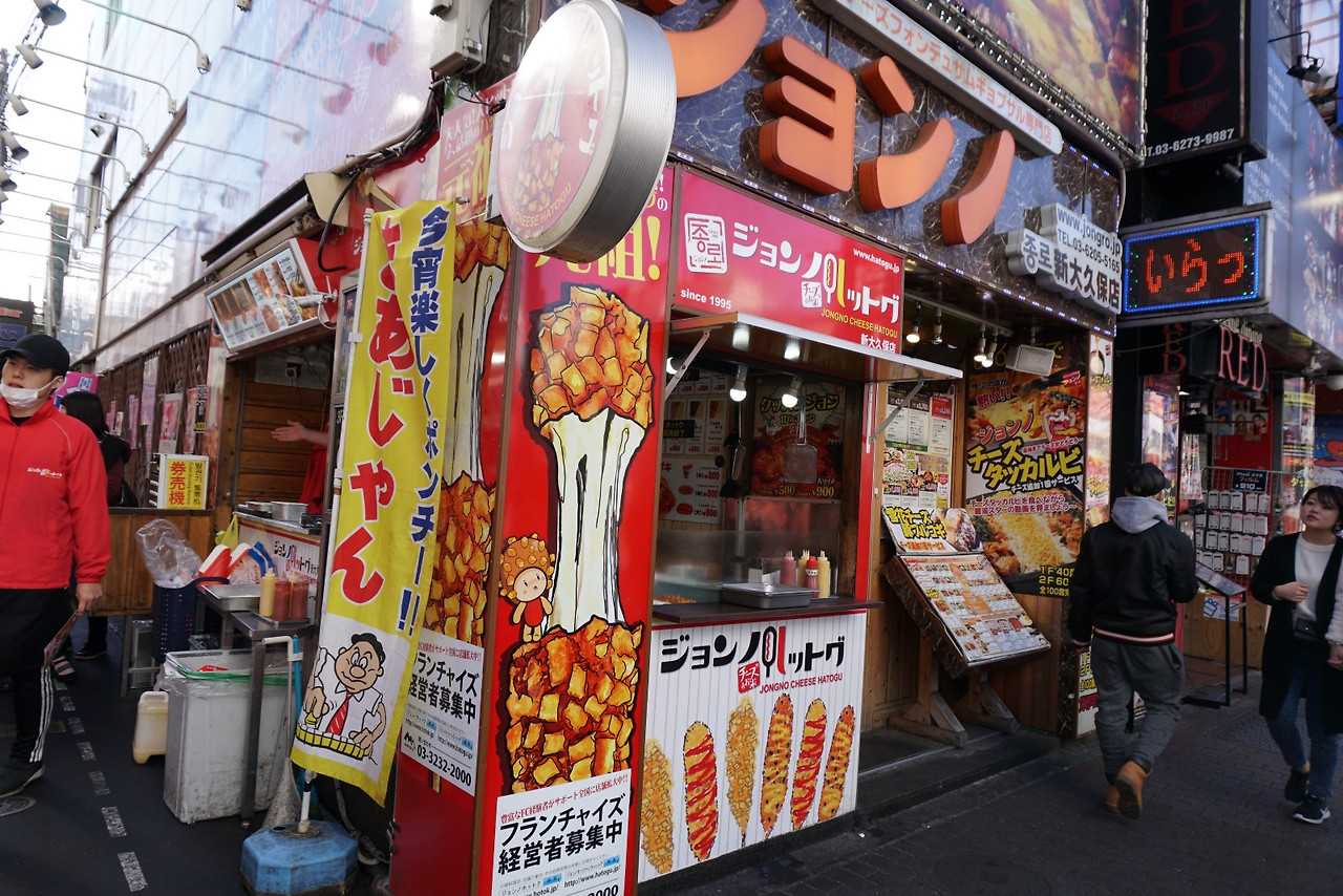 핫도그는 다양한 속과 토핑과 함께 제공되며, 가장 인기 있는 것은 모짜렐라 치즈가 들어간 것입니다. 핫도그를 물면 녹아내리는 치즈가 나와 끝없이 늘어나며, 미식가들 사이에서 인스타그램에서 큰 트렌드가 되었습니다. 신오쿠보에서 가장 인기 있는 코리안 치즈 콘도그 가게는 종노로, 마을에 3개의 매장이 있습니다.