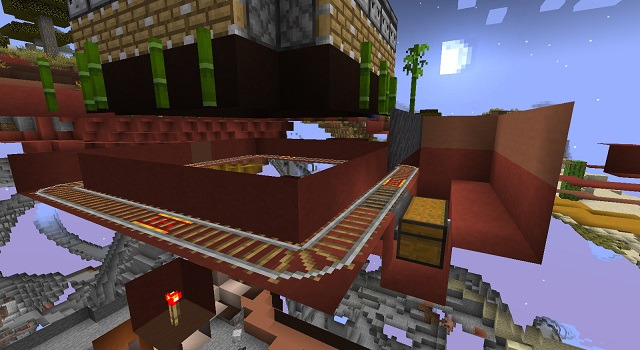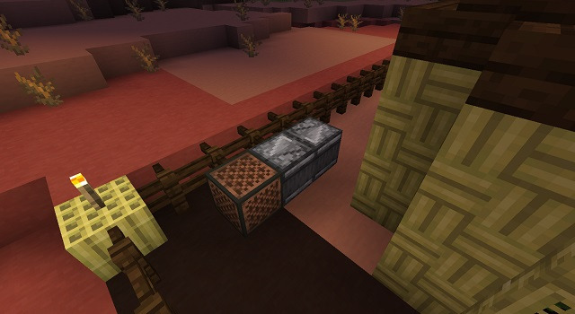 작동: 대나무와 같은 떨어진 아이템은 호퍼가 있는 미니카트로 한 블록의 간격이 있어도 접근할 수 있습니다. 따라서 미니카트가 떨어진 대나무가 있는 진흙 블록 아래를 지날 때마다 미니카트는 그 대나무를 수집합니다. 나중에 상자 옆에 있는 호퍼를 지날 때 미니카트는 수집한 아이템을 그 안에 떨어뜨립니다. 한편, 함정문은 거의 대나무가 농장 지역 밖으로 떨어지지 않도록 보장합니다.