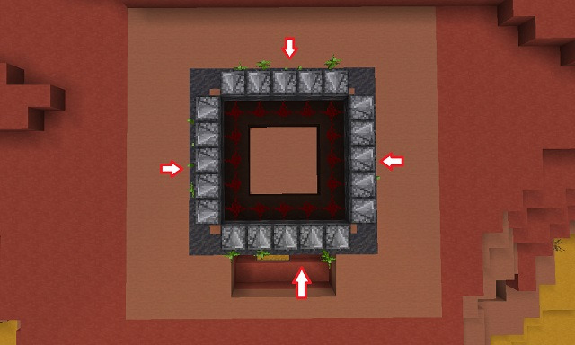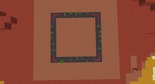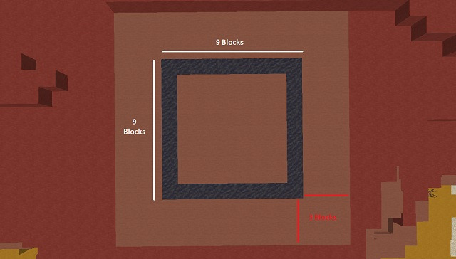 1. 먼저, 농장 중앙 구역의 기본 블록을 대체하여 진흙 블록을 사용하여 빈 사각형 (9 x 9)을 만듭니다. 경계에서 3블록 거리에 있어야 합니다.