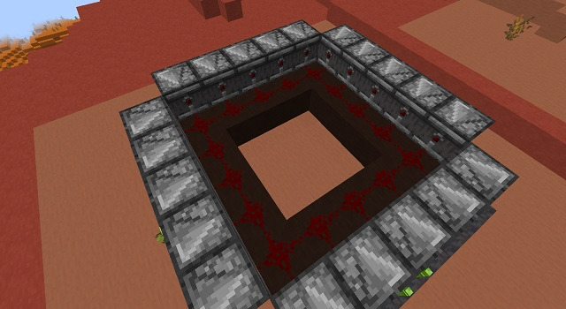 5. 마지막으로 각 피스톤 뒤에 단단한 블록(검은색 테라코타)을 놓고 각 블록 위에 레드스톤 가루를 뿌립니다 .