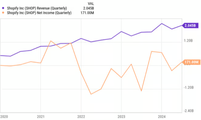 아마도 가장 중요한 점은 COVID-19 팬데믹 동안과 그로 인해 발생한 이익으로의 전환이 그 이후로 해소되었지만 쇼피파이(Shopify)가 다시 흑자로 나아가고 있다는 것입니다. 실제로 올해 2분기에 순이익 1억 7천만 달러를 보고하면서 실제 이익을 냈습니다.
