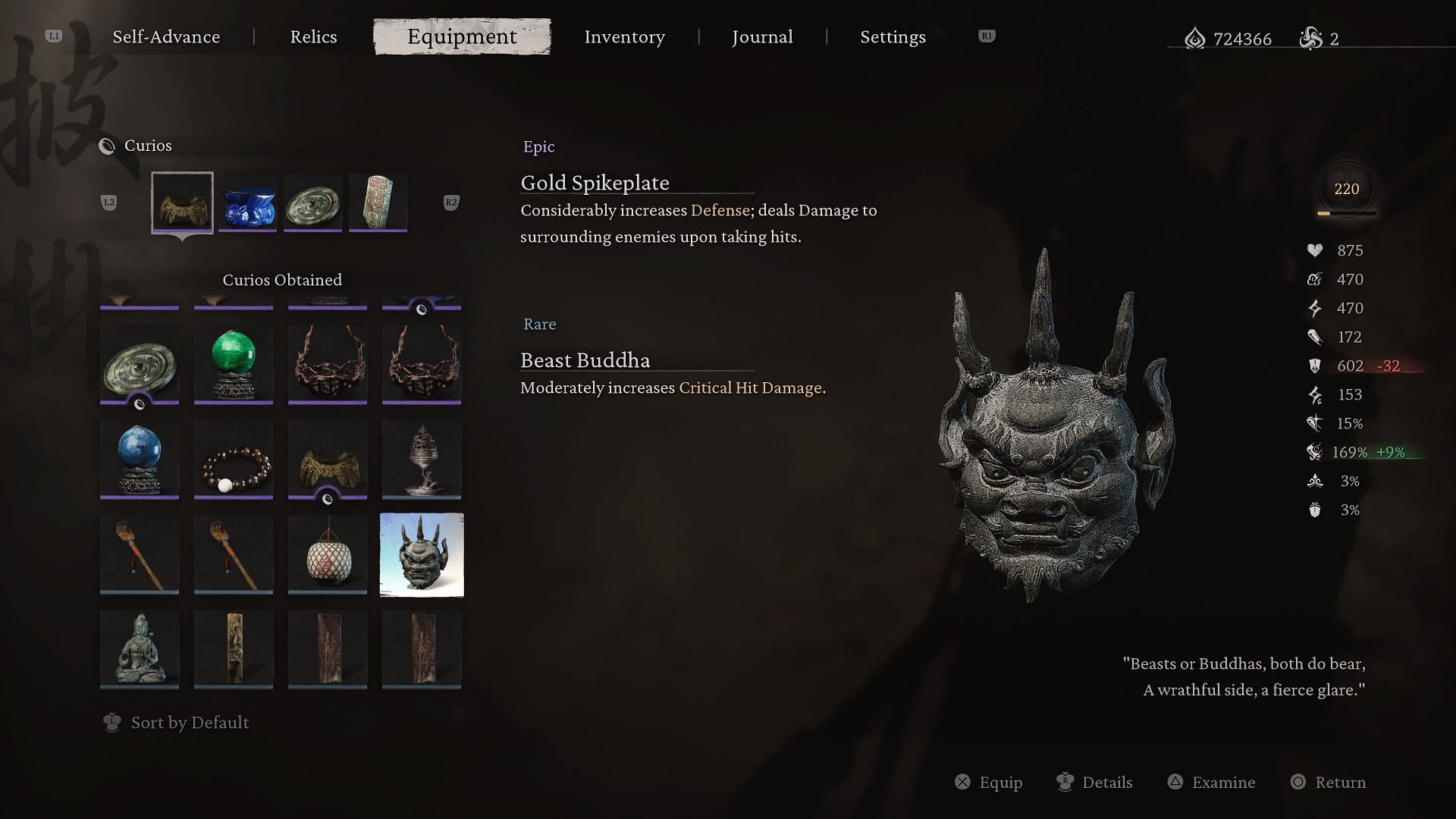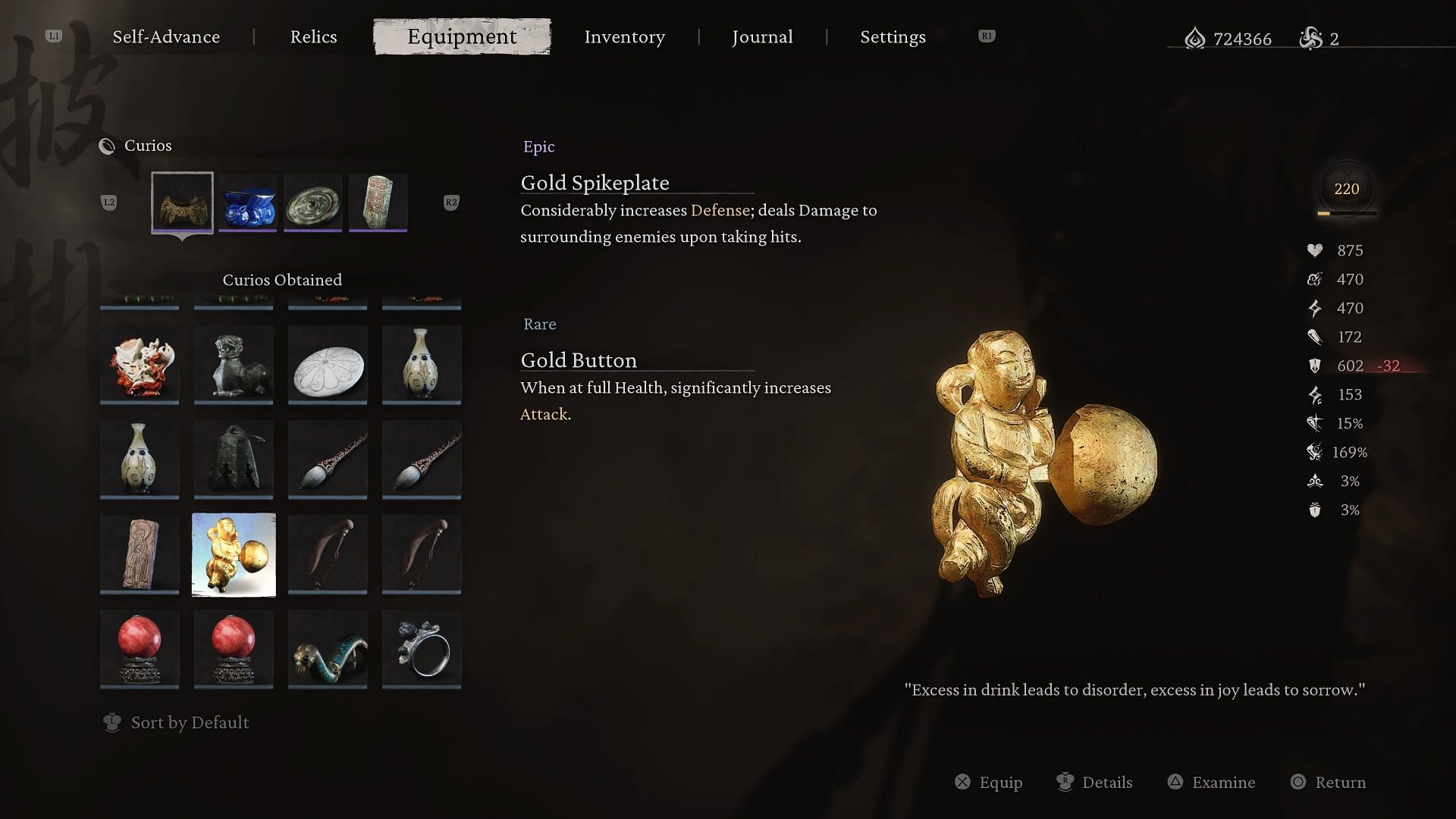 거대 락샤사 중 하나를 물리치면 골드 버튼 큐리오를 받게 됩니다. 운명의 자의 공격력을 증가시키는 짐승과 부처 큐리오 와 매우 유사합니다 . 하지만 체력이 가득 찼을 때만 효과가 나타나며, 게임 후반 보스 전투에서는 약간 까다로울 수 있습니다.