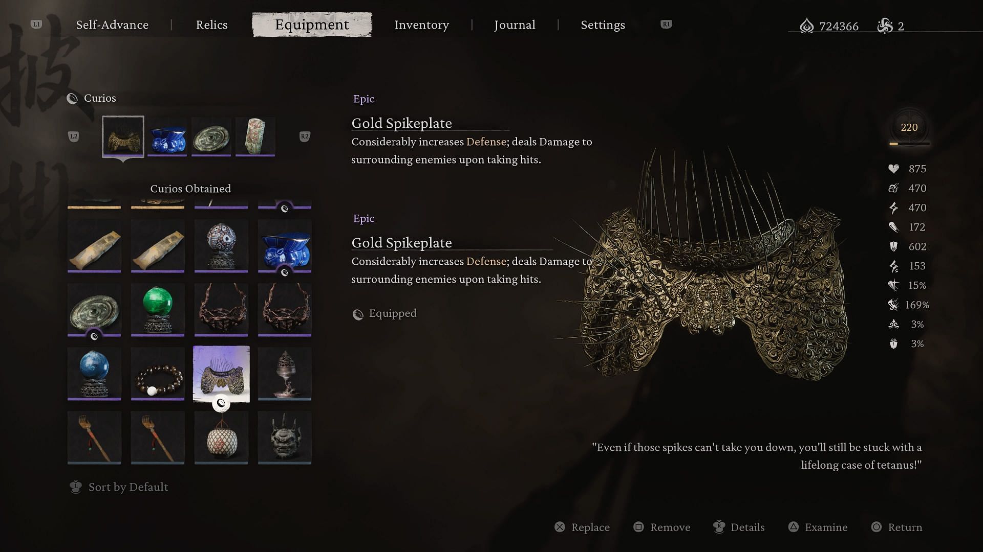 황금 종려 갑옷(Gold Spikeplate)은 검은신화 오공의 대부분 장신구에 일반적으로 적용되는 것과는 달리 두 가지 주요 효과을 제공합니다.
