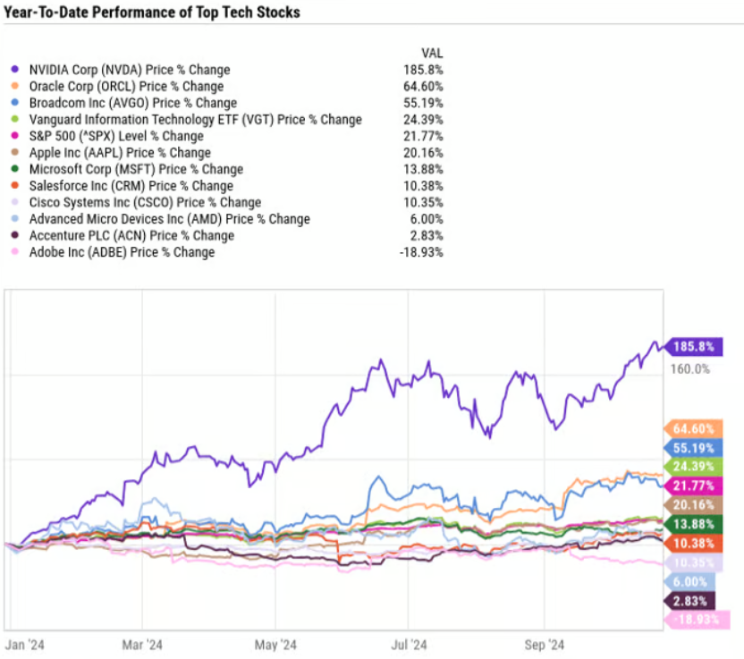 기술 부문과 긴밀히 연관된 Vanguard Information Technology ETF 는 연초 이래(YTD) 21.8% 상승했는데, 이는 S&P 500보다 약간 높습니다. 어도비(Adobe)는 이러한 벤치마크에 뒤처지는 데 그치지 않고, 연초 이래 19% 하락했으며 Vanguard Information Technology ETF의 상위 10개 보유 종목 중 최악의 성과를 기록하고 있습니다.