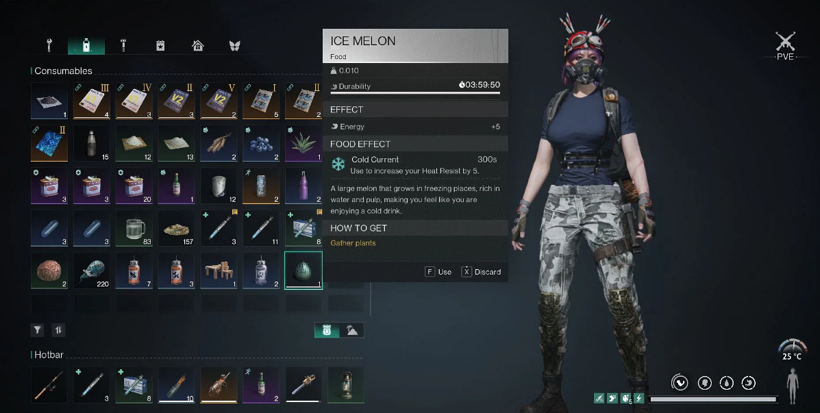 아이스 멜론은 생으로 먹거나 요리 재료로 사용하여 원스휴먼(Once Human) 혹독한 겨울에서 열 저항력을 높일 수 있습니다. 이 과일과 이 과일로 만든 각 품목의 통계는 다음과 같습니다.