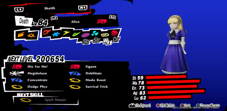 앨리스는 타에 타케미와 함께 Death Confidant 트랙을 완료 해야만 사용 가능해집니다 . 그녀는 그 아르카나의 궁극적 페르소나이기 때문입니다. 하지만 앨리스는 즉사 기술에 대한 매우 높은 성공률을 가지고 있고, 그 성공률은 그녀를 적절한 페르소나와 융합함으로써 높일 수도 있기 때문에 노력할 가치가 있습니다.