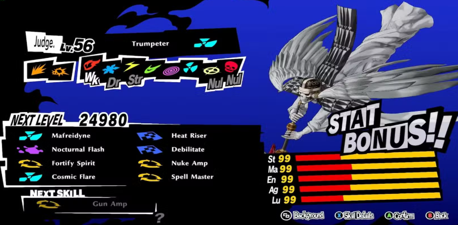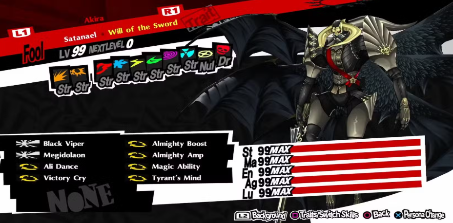 사타나엘 을 훌륭하게 만드는 것은 약점이 없고, 두 가지 면역이 있고, 심각한 전능, 핵 및 총 피해를 입힐 수 있는 능력 과 Tyrant's Mind, Pagan Allure 및 Magic Ability의 조합을 통해 모든 공격을 최대 100%까지 높일 수 있는 능력입니다. 다음 항목이 없었다면 그는 궁극의 페르소나가 되었을 것입니다.