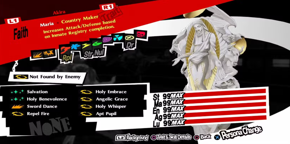 Maria는 Persona 5 Royal에서만 볼 수 있지만, 다행히도 DLC 페르소나는 아닙니다. 오히려 그녀는 Faith Arcana의 궁극적 페르소나로, Sumire's Confidant 서브 스토리를 완료해야만 얻을 수 있습니다. 그녀는 Ishtar의 치유 기술에 대한 75% 비용 감소를 가지고 있지 않지만, 그녀는 통계와 그녀가 사용할 수 있는 기술로 그것을 충분히 보완합니다.