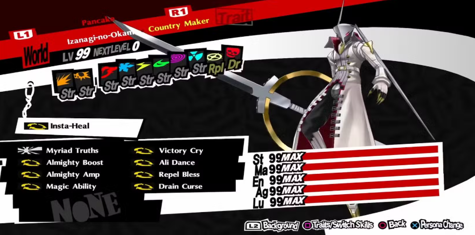 이자나기노오카미는 모든 것에 저항하며 가장 강력한 만능 공격을 가지고 있습니다: Myriad Truths. 이 공격은 모든 적에게 3번 큰 만능 피해를 입히고, 그가 Almighty Boost 스킬을 사용할 수 있기 때문에 피해가 25% 증가할 수 있습니다. 그의 "Country Maker" 특성은 또한 그의 피해를 100% 증가시키고 받는 피해를 50% 감소시킵니다. 그는 완벽한 탱커입니다.