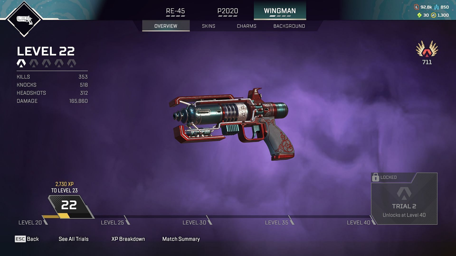 일반 모드에서 Wingman은 총알을 꽤 많이 소모하는 반면 탄약 스택이 다소 작기 때문에 가장 적게 사용되는 무기 중 하나입니다. 그러나 런치 로얄 모드에서는 플레이어가 사용할 수 있는 최고의 무기입니다. 현재 Wingman과 달리 게임 모드에서는 Skullpiercer 홉업과 함께 사용할 수 있으며, 이는 각 샷의 헤드샷 데미지를 크게 증가시킵니다.