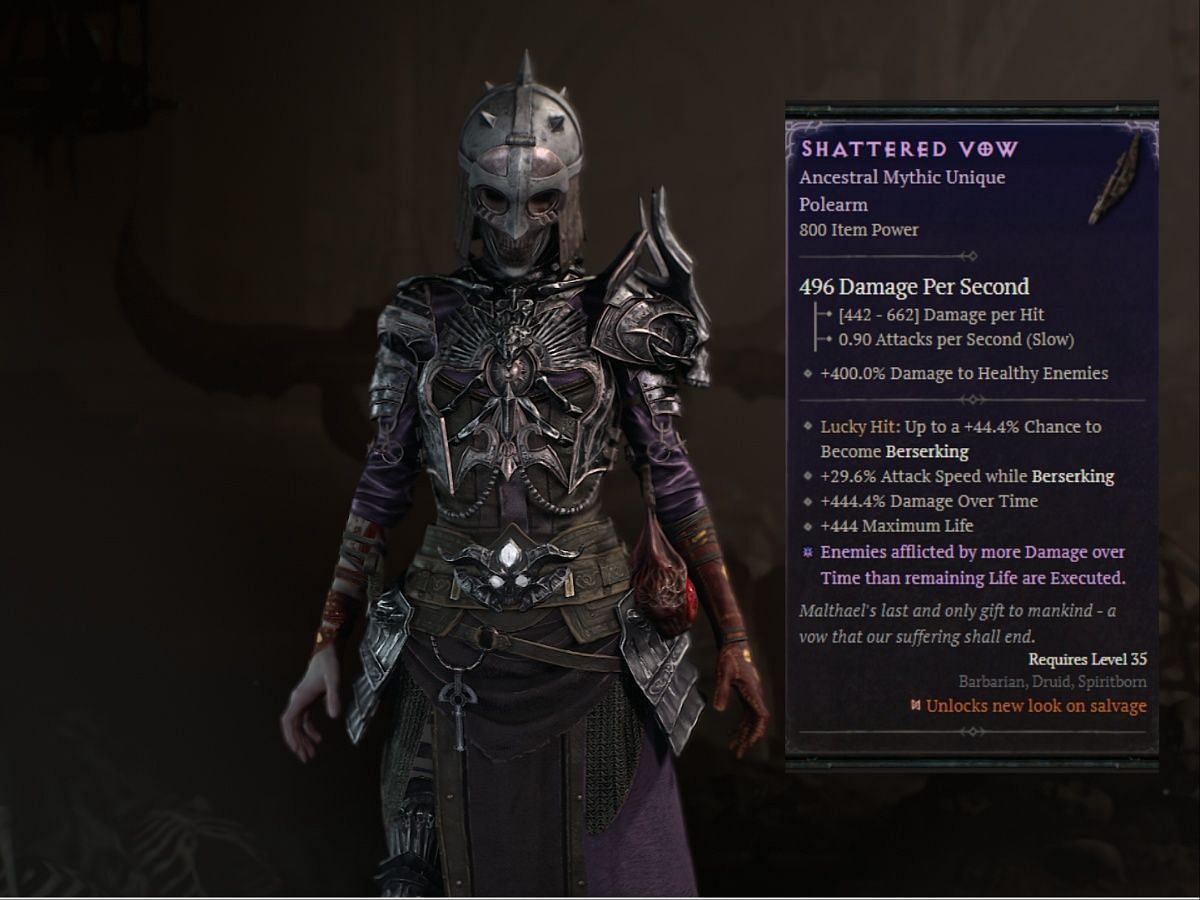 또한 놀라운 새로운 Mythic Unique인 Shattered Vow가 있는데 , 이는 대상에게 남은 생명력보다 더 많은 지속 피해를 입힙니다. 이번 시즌의 새로운 장비는 정말 강력하게 느껴지고, 저는 압도적인 느낌을 좋아합니다.