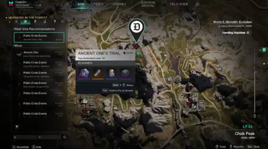 원스휴먼(Once Human)에서 고대의 시련을 시작하려면 Chalk Peak 지역의 산의 높이를 받아들여야 합니다. 지도를 열고 X를 눌러 현재 진행 중인 모든 공개 위기 이벤트를 표시할 수 있습니다. Chalk Peak 지역에서는 대략 (좌표: 2329,-5204)에서 가장 높은 산을 찾은 다음 근처 텔레포터를 타야 합니다.