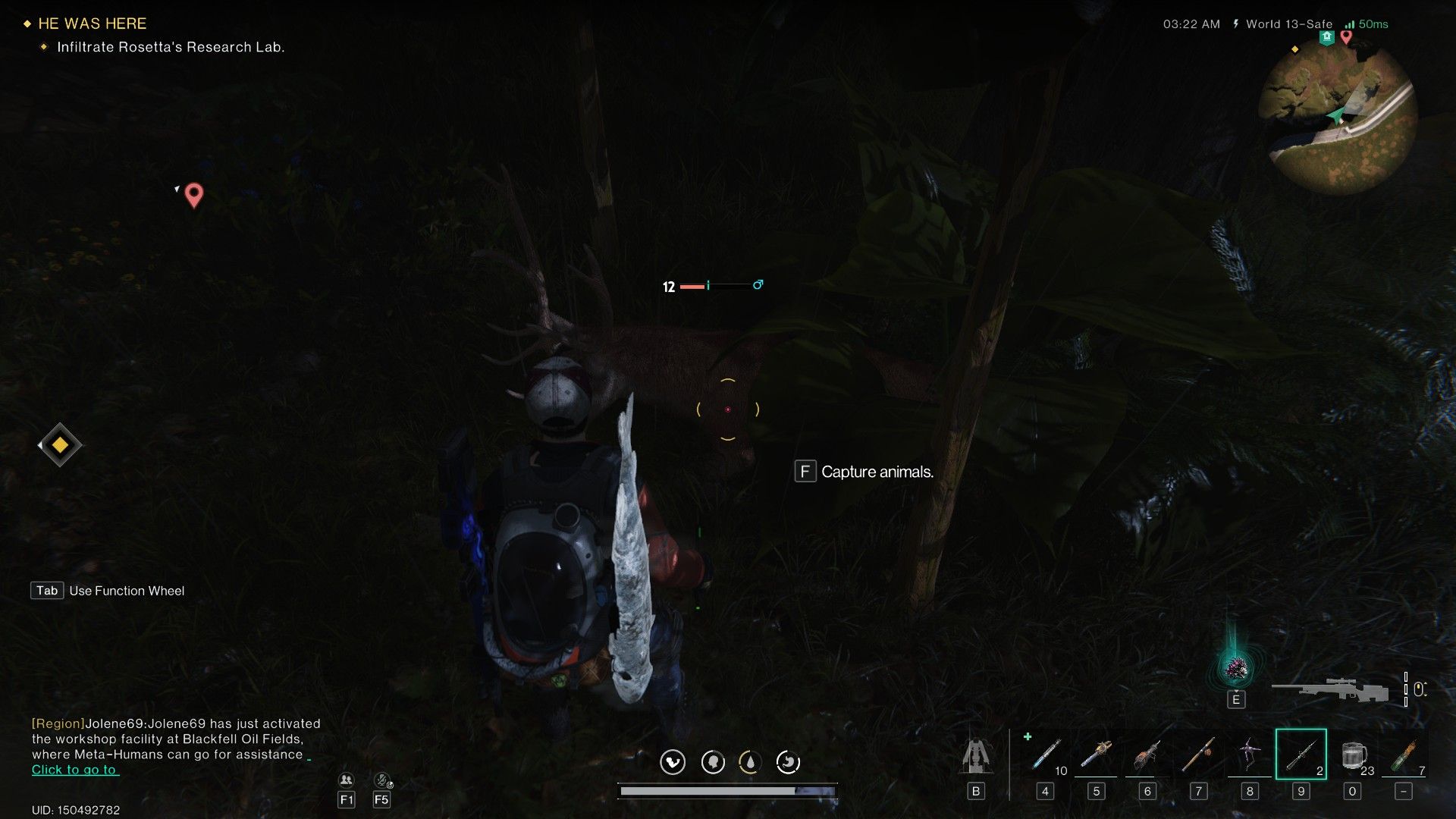 동물을 성공적으로 진정시키면 동물이 제압되어 원스휴먼 에서 잡을 준비가 됩니다. F를 눌러 진정된 동물을 백팩에 추가할 수 있습니다.