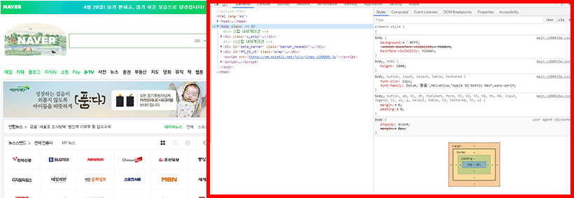 ▲키보드 F12를 누르면 볼 수 있는 웹 페이지 소스코드 (출처: 네이버 메인 화면)