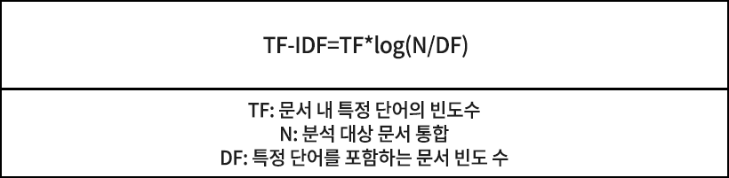 단순하게는, TF 값이 큰 단어일수록 중요도가 높다고 판단할 수 있지만, 사실 TF 값이 큰 단어는 모든 문서에서 자주 등장하는, 즉 그 단어가 흔하게 등장한다는 것을 의미하는 ‘문서빈도(Document Frequency: DF)’ 값이 큰 단어일 수 있다. 이에, 중요도 높은 키워드 도출을 위해 TF-IDF라는 값을 사용한다. TF-IDF는 DF값의 역수인 IDF(역문서 빈도, inverse document frequency)에 단순단어 빈도(TF)값을 곱한 것으로, 이처럼 모든 문서에서 자주 출현하는 상투어를 걸러내기 위함이며, 이는 단순한 단어의 빈도 처리가 아닌 단어의 출현 확률을 기준으로 출현 빈도를 재가공 한 것이다.