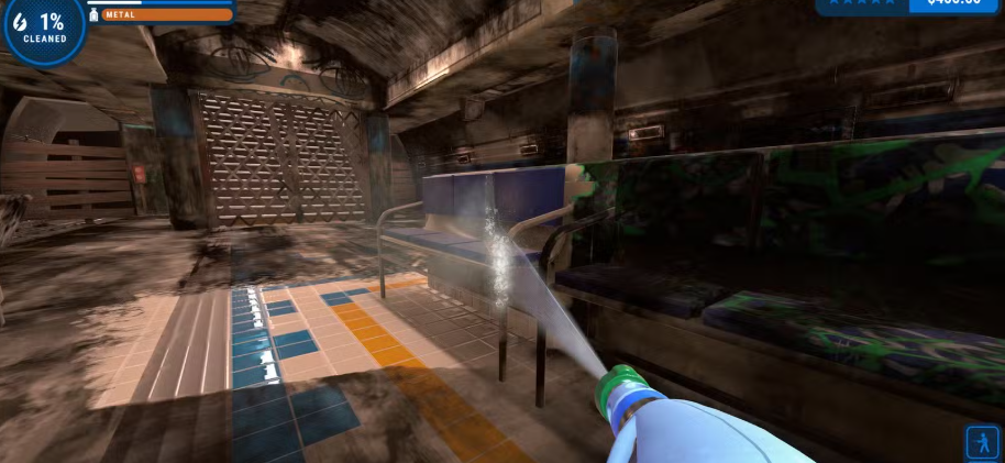 Power Washing Simulator의 한 장면, 스테이션에서 더러운 벤치를 세척하는 모습스퀘어 에닉스 미디어 자산