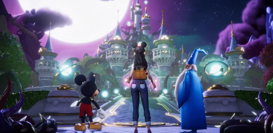 플레이어가 성 앞에 미키와 멀린과 함께 서 있습니다.