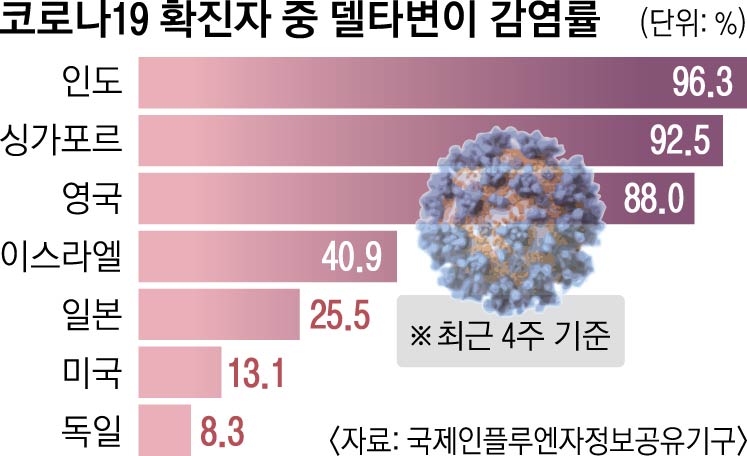 2021년 6월부터 봉쇄조치를 전면 해제하려던 영국은 델타 변이에 발목을 잡혔다. 영국 정부는 전체 인구의 60% 이상이 1차 접종을 마쳐 오는 21일 ‘자유의 날’을 선포할 예정이었다. 하지만 델타 변이 확산으로 하루 신규 확진자가 8000여 명까지 치솟자 경제 정상화 조치를 한 달 뒤로 미뤘다. 영국 내 신규 확진자의 90% 이상은 델타 변이에 의한 것으로 나타났다. 델타 변이의 진원지인 인도도 여전히 하루 확진자 수가 6만~7만 명 수준이다.