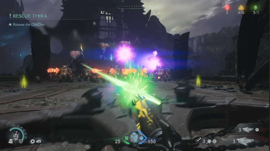 뿐만 아니라 게임에는 세 가지의 개별 근접 무기가 존재하며, 각각 고유의 업그레이드 트리와 리차지 시스템이 있습니다. 그 중에는 ‘플레일(철퇴)’도 있어, 원초적인 타격감을 느끼기에 충분합니다.