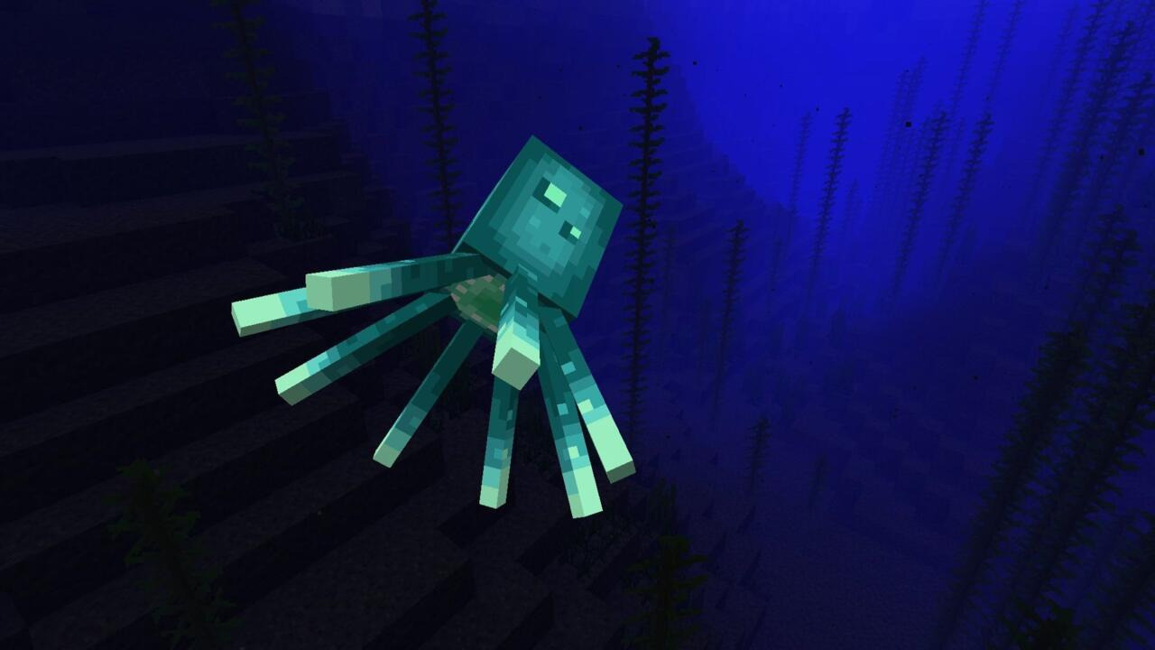 이 수동적인 수생 몹들은 오버월드의 강과 바다에서 생성됩니다. 물속에서 헤엄치며 다른 몹을 공격하지 않습니다. 플레이어가 접근하면 당황하여 도망치기 전에 잉크를 뿜어냅니다. 죽으면 잉크 주머니를 떨어뜨리는데, 이 잉크 주머니는 검은색 염료와 책, 깃펜을 만드는 데 필수적입니다. 오징어는 길들이거나 번식시킬 수 없지만, 염료 농장을 설치하거나 기지의 어항에 추가하는 데 유용하게 쓰일 수 있습니다.