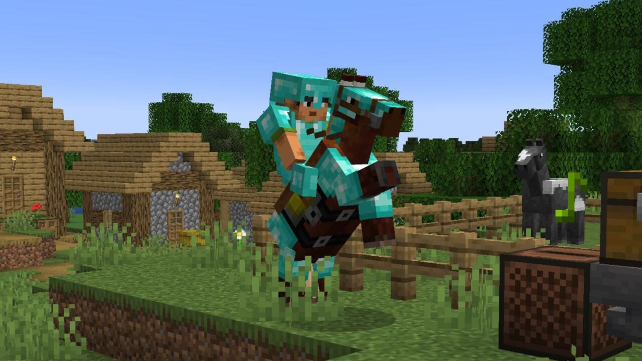 플레이어는 다이아몬드 갑옷을 입고 말을 탄다