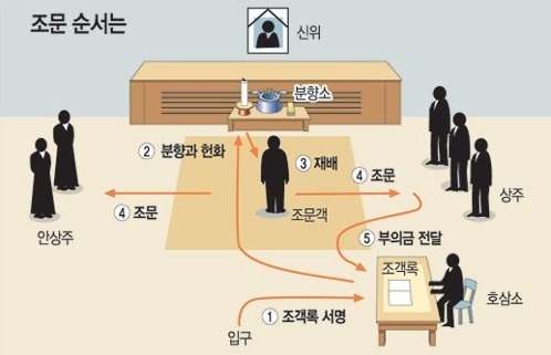 • 조의금은 분향소에 들어가거나 나올 때 하는 것이 예의며, 상주에게 직접 건네는 것은 실례다.