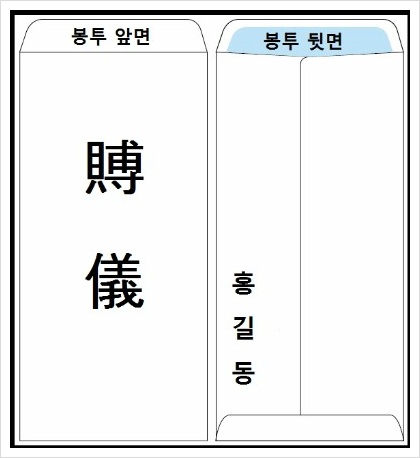 • 부조하는 사람의 이름 뒤에는 아무것도 쓰지 않아도 되지만 '근정(謹呈)', '근상(謹上)'이라고 쓰기도 한다.