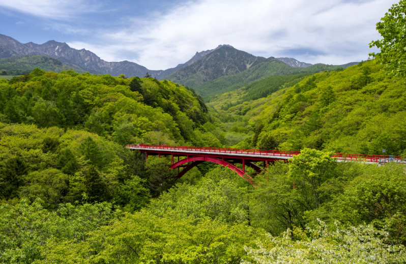 '히가시자와 오하시(東沢大橋)'는 야쓰가타케 산맥을 배경으로 한 붉은 다리로, 가을 단풍과 어우러져 아름다운 풍경을 자아냅니다.