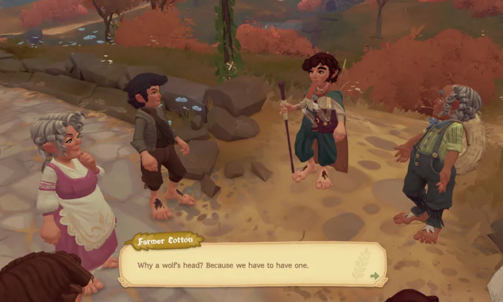 게임에는 간달프나 로지 코튼 같은 익숙한 캐릭터들이 등장하며, 바이워터가 공식적으로 마을로 인정받기 위해 이웃들의 심부름을 하게 됩니다. 스토리 자체는 단순하지만 호빗들이 사소한 일들로 다투고 말다툼하는 모습에서 나름의 재미를 찾을 수 있습니다. 하지만 음성 연기가 전혀 없어서 다채로운 캐릭터들이 15시간의 플레이타임 동안 완전히 조용한 것은 아쉬운 부분입니다.