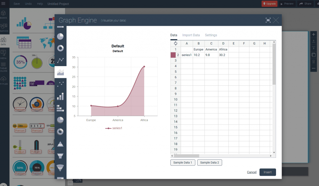 칸바는 SNS 이미지와 인포그래픽 디자인으로 유명하지만 그래프 그리는 사이트 로 자주 활용됩니다. 칸바는 전문 디자이너보다 인상적인 그래프 그리기 싶어하는 아마추어들에게 더 좋은 선택입니다. 20개 이상의 차트와 템플릿이 있고 간단한 그래프 그리기 가능합니다. 그래프는 PNG, JPG, PDF로 저장할 수 있으며, 웹페이지에서 인쇄할 수 있습니다. 게다가 다른 사용자들과 공유해서 SNS에 올리는 것도 쉬운 일입니다.