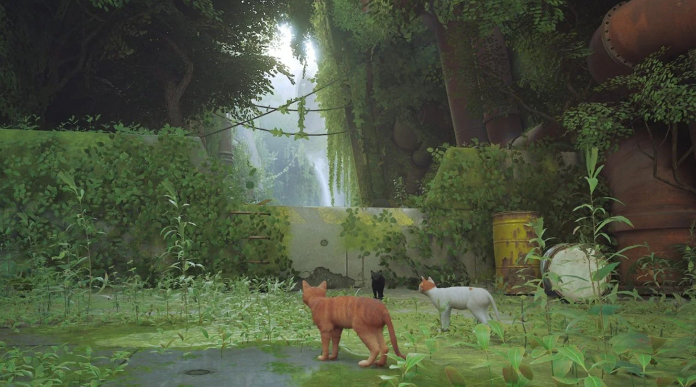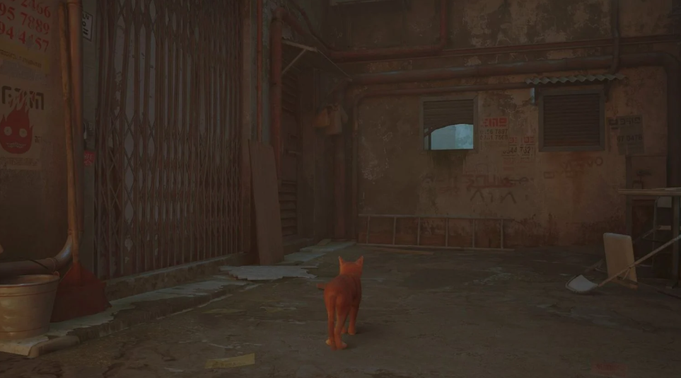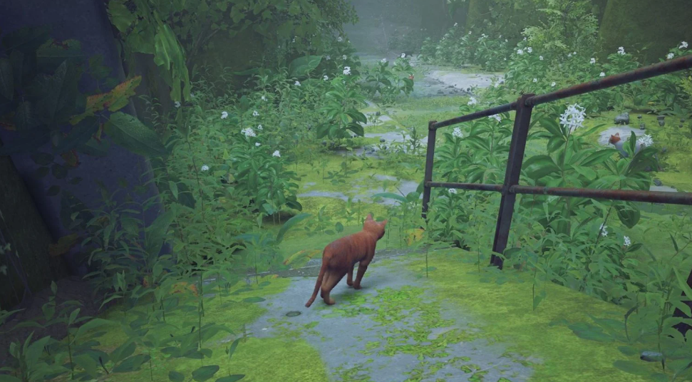 스트레이(STRAY)는 고양이가 주인공인 사이버펑크 게임으로, 독특한 관점에서 맵 설계 기법을 보여줍니다. 게임 초반 동료 고양이들과 산책하는 장면에서는 올라갈 수 있는 벽임을 알려주기 위해 일부 풀이 벗겨져 있습니다.