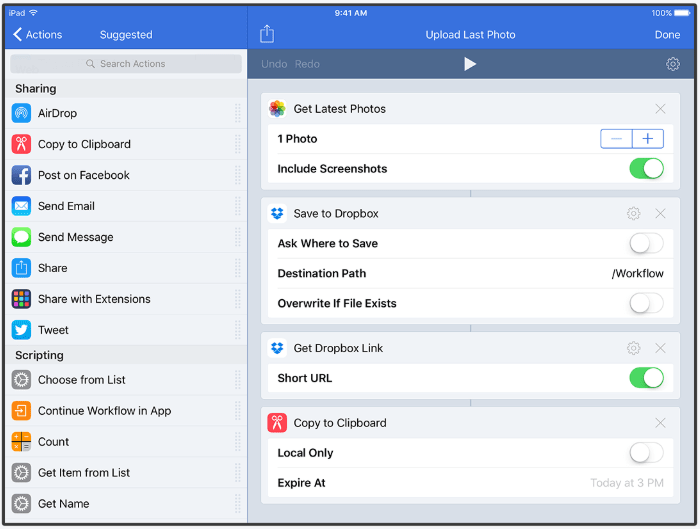 Workflow 는 한 곳에서 관리할 수 있도록 모든 앱을 그룹화하여 워크플로를 자동화하는 것을 목표로 하는 또 다른 앱입니다. 그러나 이 앱과 Shift의 차이점은 Workflow를 사용하면 각 앱에서 특정 작업, 즉 워크플로를 선택한 다음 몇 번의 클릭으로 해당 작업을 활성화할 수 있다는 것입니다.