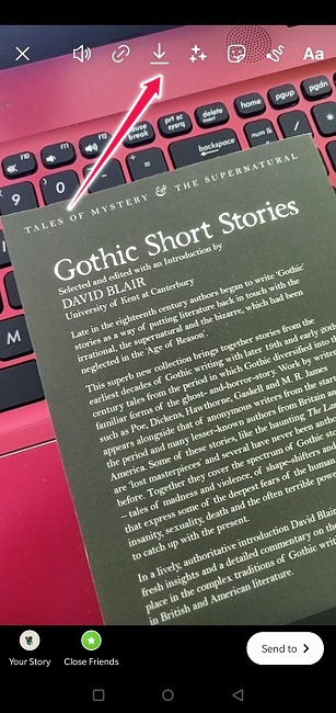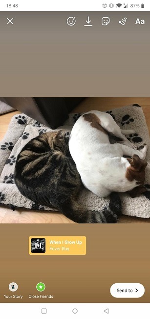 표준 Instagram 게시물에 음악을 추가하려는 경우 나쁜 소식은 어쨌든 이미지가 아니라 할 수 없다는 것입니다. 그러나 위의 섹션에 설명된 단계에 따라 음악적 배경이 있는 빠른 비디오 스토리를 촬영할 수 있습니다. 스토리로 올리는 대신, 상단의 다운로드 버튼을 눌러 휴대폰에 저장한 후 프로필에 뮤직비디오를 올려주세요.