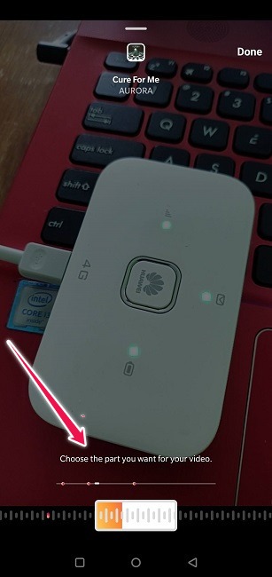 4. 트랙을 결정했으면 해당 트랙을 탭한 다음 스토리에 포함할 노래 부분을 선택합니다. 스토리는 최대 15초에 걸쳐 있으므로 오디오는 최소 5초로 동일한 규칙을 따라야 합니다. 완료를 클릭하여 프로세스를 진행합니다.