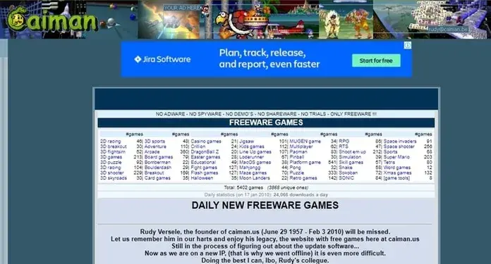 Caiman.us는 프리웨어 게임 다운로드 웹사이트입니다. 게임 및 소프트웨어 배포 사이트입니다. 그들은 2D 및 3D 게임의 광범위한 라이브러리를 가지고 있습니다. 또한 20개 이상의 게임 카테고리를 제공합니다. Caiman.us의 인기 있는 장르 중 일부는 레이싱, 아케이드, 퍼즐 및 카드 게임입니다. 다운로드 절차는 간단합니다. Caiman.us를 사용하기 위해 어떤 형태의 계정이나 가입도 필요하지 않습니다.
