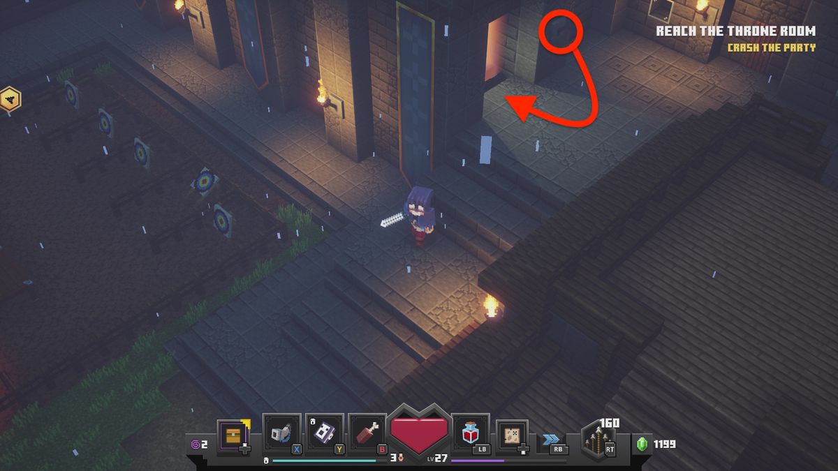 홀을 통과할 때 황금 열쇠 골렘을 사용하여 열린 안뜰 지역에 도달합니다. 안뜰의 동쪽(오른쪽 위) 을 따라 파티에 가는 길 중 하나 역할을 하는 우물 이 있습니다.