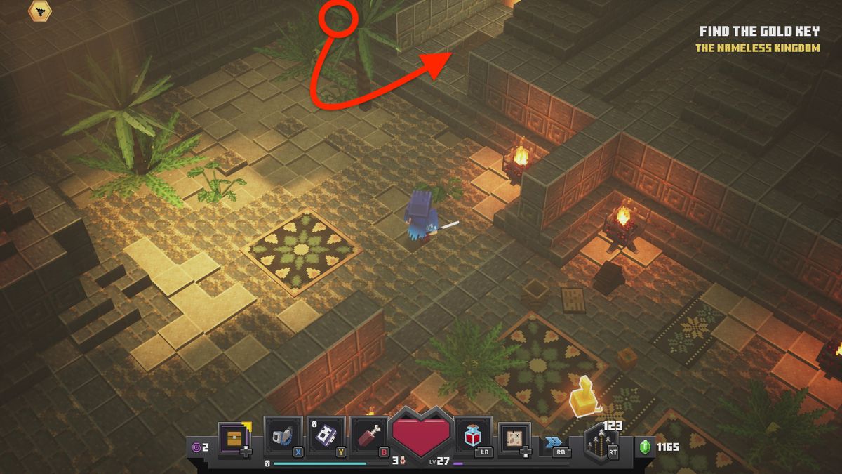 황금 열쇠 를 찾는 것이 목표가 될 때까지 사원과 무덤을 통과하십시오 . 남쪽으로 가서 황금 열쇠 골렘을 찾을 때까지 방을 탐색하십시오.