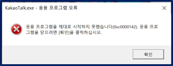 0xc0000142 오류의 경우 특정 프로그램을 실행할 때 나타나는 오류로 해당 오류창이 뜨면서 특정 프로그램이 정상적으로 실행되지 않는 현상이 발생합니다. 저의 경우에는 잘 사용중이던 카톡을 실행할때 이런 에러가 발생되었는데요,