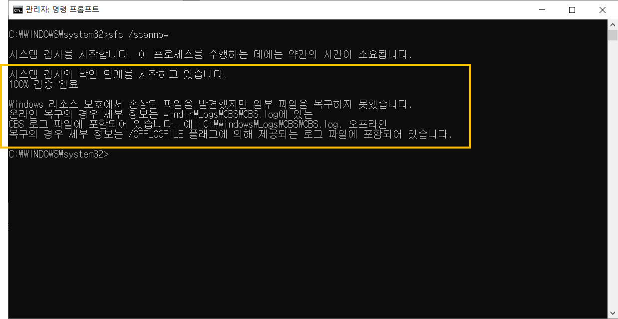 - 커맨드 창에 sfc /scannow 명령어 입력 후 엔터